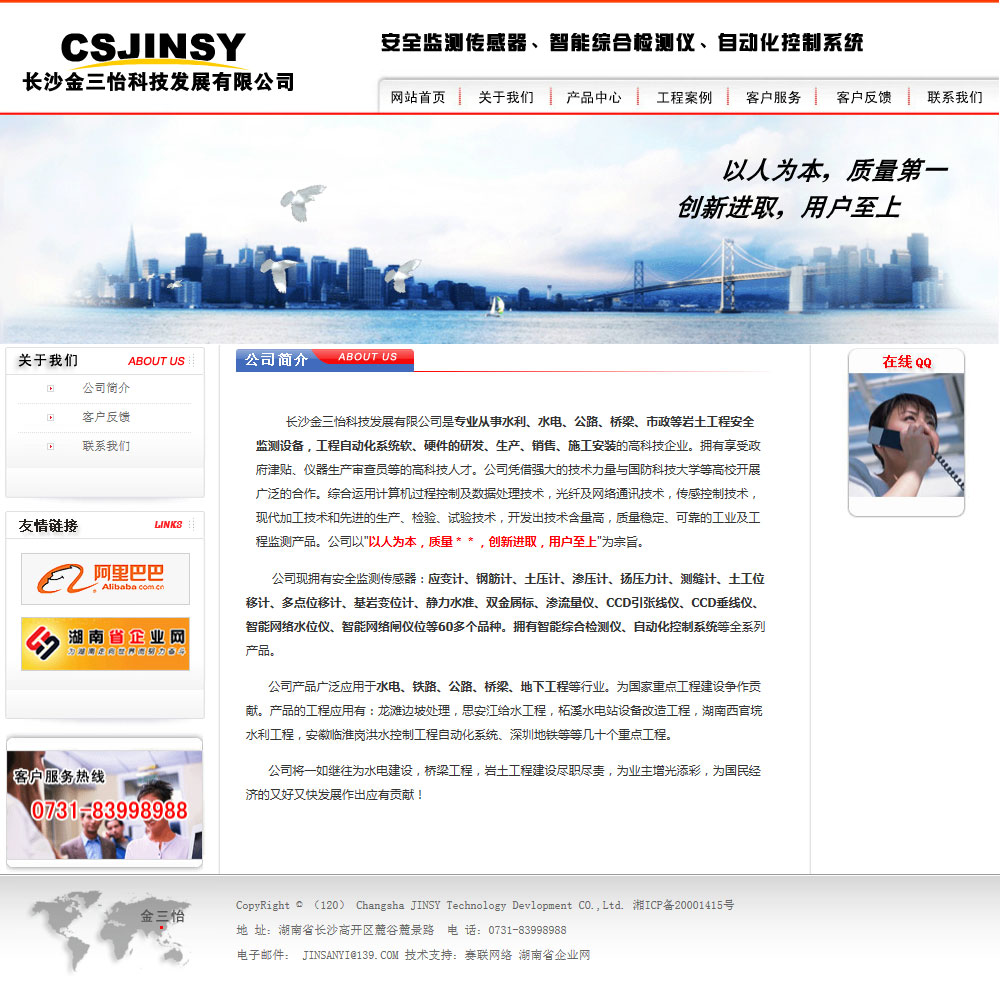 長沙金三怡科技發(fā)展有限公司是專業(yè)從事水利、水電、公路、橋梁、市政等巖土工程安全監(jiān)測設備,工程自動化系統(tǒng)軟、硬件的研發(fā)、生產(chǎn)、銷售、施工安裝的高科技企業(yè)。擁有享受政府津貼、儀器生產(chǎn)審查員等的高科技人才。公司憑借強大的技術力量與國防科技大學等高校開展廣泛的合作。綜合運用計算機過程控制及數(shù)據(jù)處理技術,光纖及網(wǎng)絡通訊技術,傳感控制技術,現(xiàn)代加工技術和先進的生產(chǎn)、檢驗、試驗技術,開發(fā)出技術含量高,質(zhì)量穩(wěn)定、可靠的工業(yè)及工程監(jiān)測產(chǎn)品。公司以