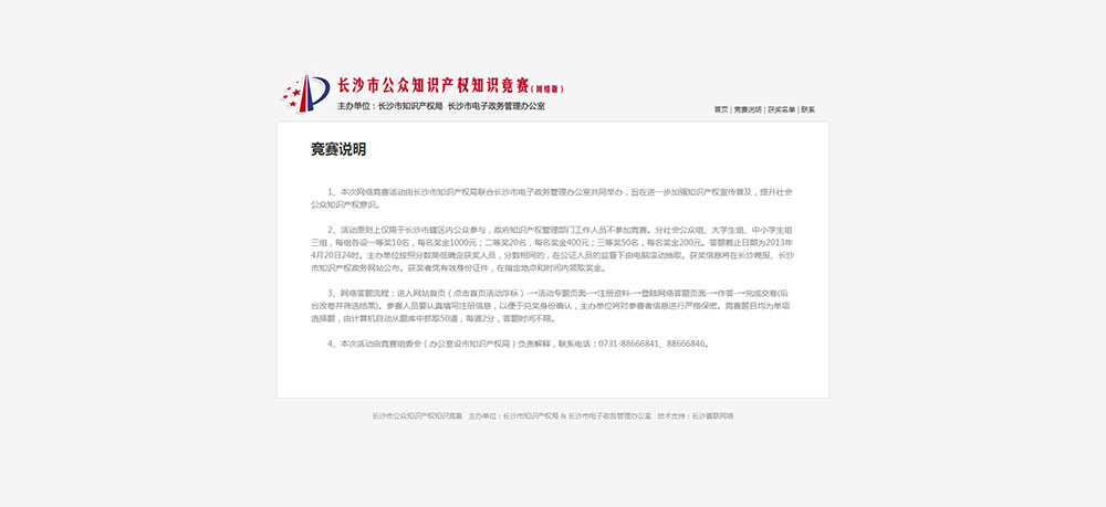 競賽說明 1、本次網(wǎng)絡(luò)競賽活動由長沙市知識產(chǎn)權(quán)局聯(lián)合長沙市電子政務(wù)管理辦公室共同舉辦,旨在進一步加強知識產(chǎn)權(quán)宣傳普及,提升社會公眾知識產(chǎn)權(quán)意識。 2、活動原則上僅限于長沙市轄區(qū)內(nèi)公眾參與,政府知識產(chǎn)權(quán)管理部門工作人員不參加競賽。分社會公眾組、大學(xué)生組、中小學(xué)生組三組,每組各設(shè)一等獎10名,每名獎金1000元;二等獎20名,每名獎金400元;三等獎50名,每名獎金200元。答題截止日期為2013年4月20日24時。主辦單位按照分數(shù)高低確定獲獎人員,分數(shù)相同的,在公證人員的監(jiān)督