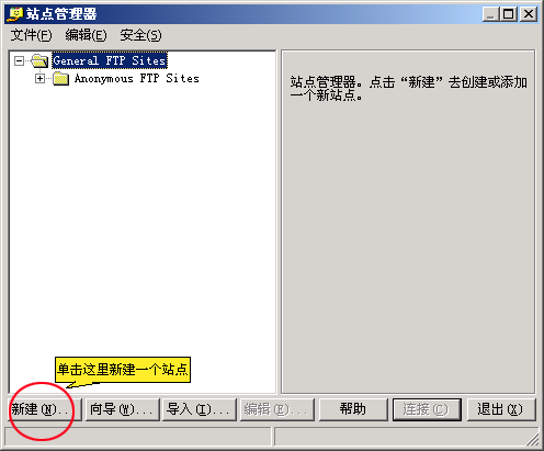 1、打開FTP,彈出“站點(diǎn)管理器”,點(diǎn)擊左下面的"新建",如下圖界面: