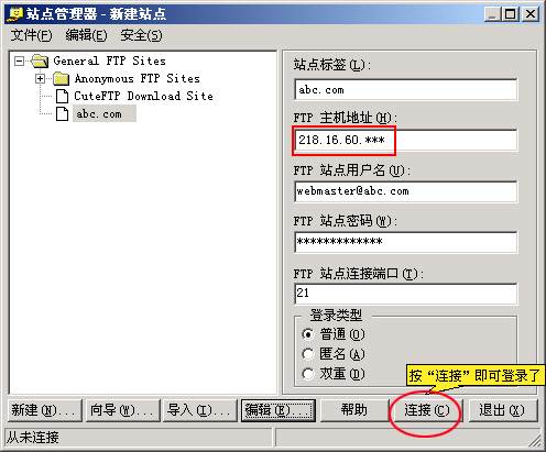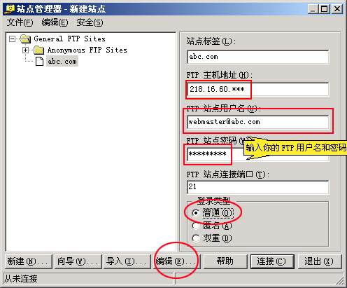 3、然后在右邊對話框中輸入站點(diǎn)標(biāo)簽(如abc.com),輸入主機(jī)地址,用戶名,密碼和登錄類型要選擇“普通”,輸入完成后,點(diǎn)擊下面菜單欄的“編輯”,界面如下: