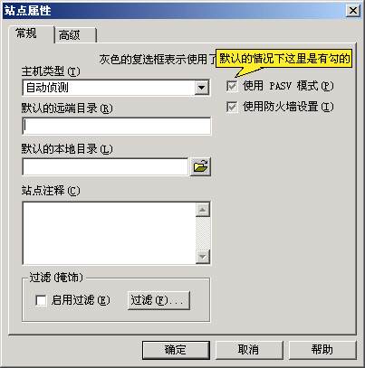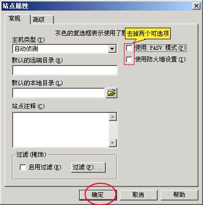 5、在這個(gè)對話框中,選"常規(guī)"標(biāo)簽,取消"使用 PASV 模式"可選項(xiàng)。接著按“確定”,界面顯示如下: